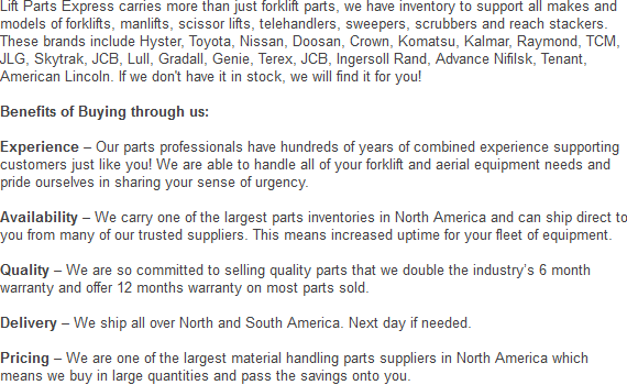 All our lift truck parts are obtainable at the best prices. If you are interested in getting a quote for our parts or attachments, give us a phone call now at: